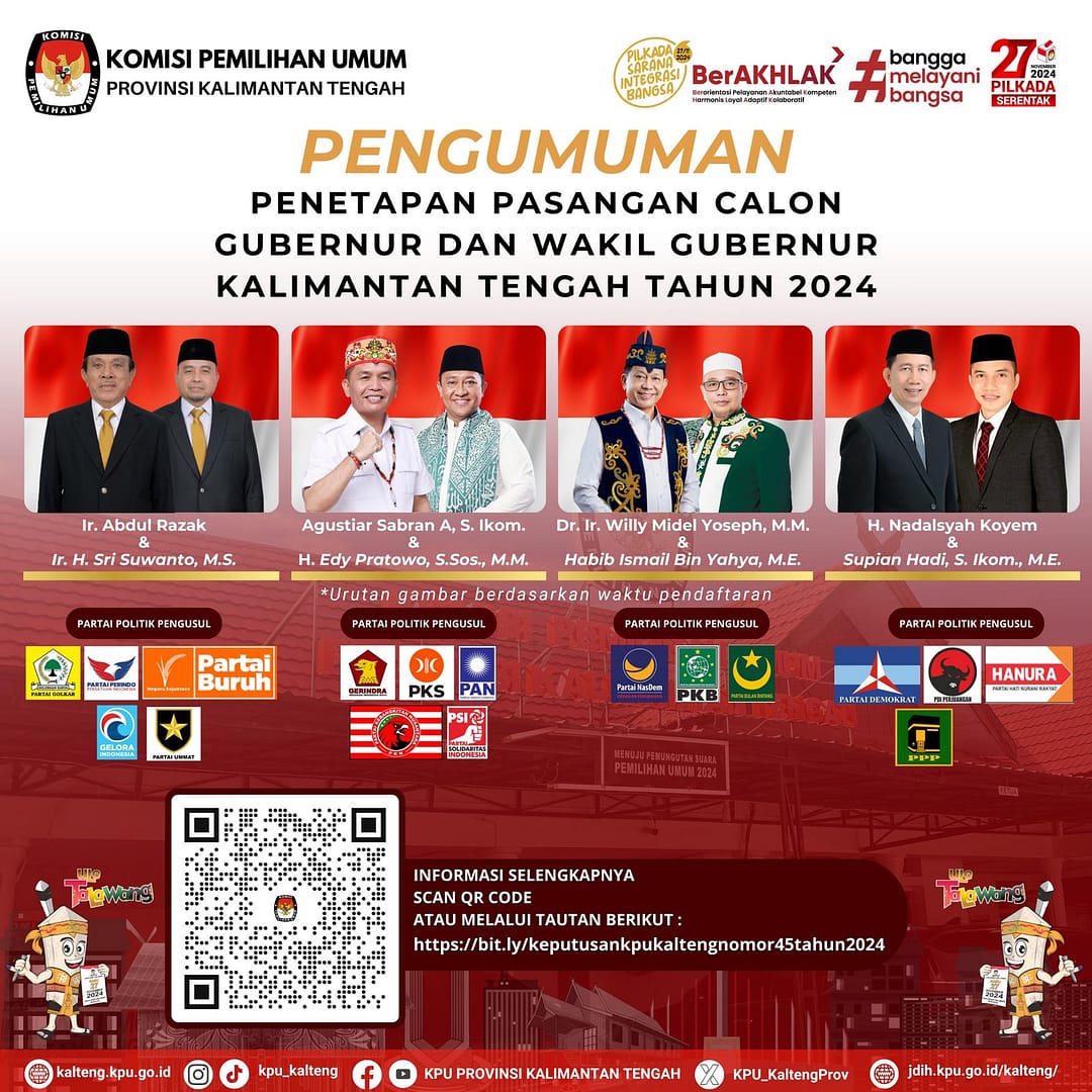 PALANGKARAYA – Komisi Pemilihan Umum (KPU) Kalteng secara sah menetapkan 4 kandidat Pasangan Calon (Paslon) untuk bertarung di Pemilihan Kepala Daerah (Pilkada) Kalteng tahun 2024.