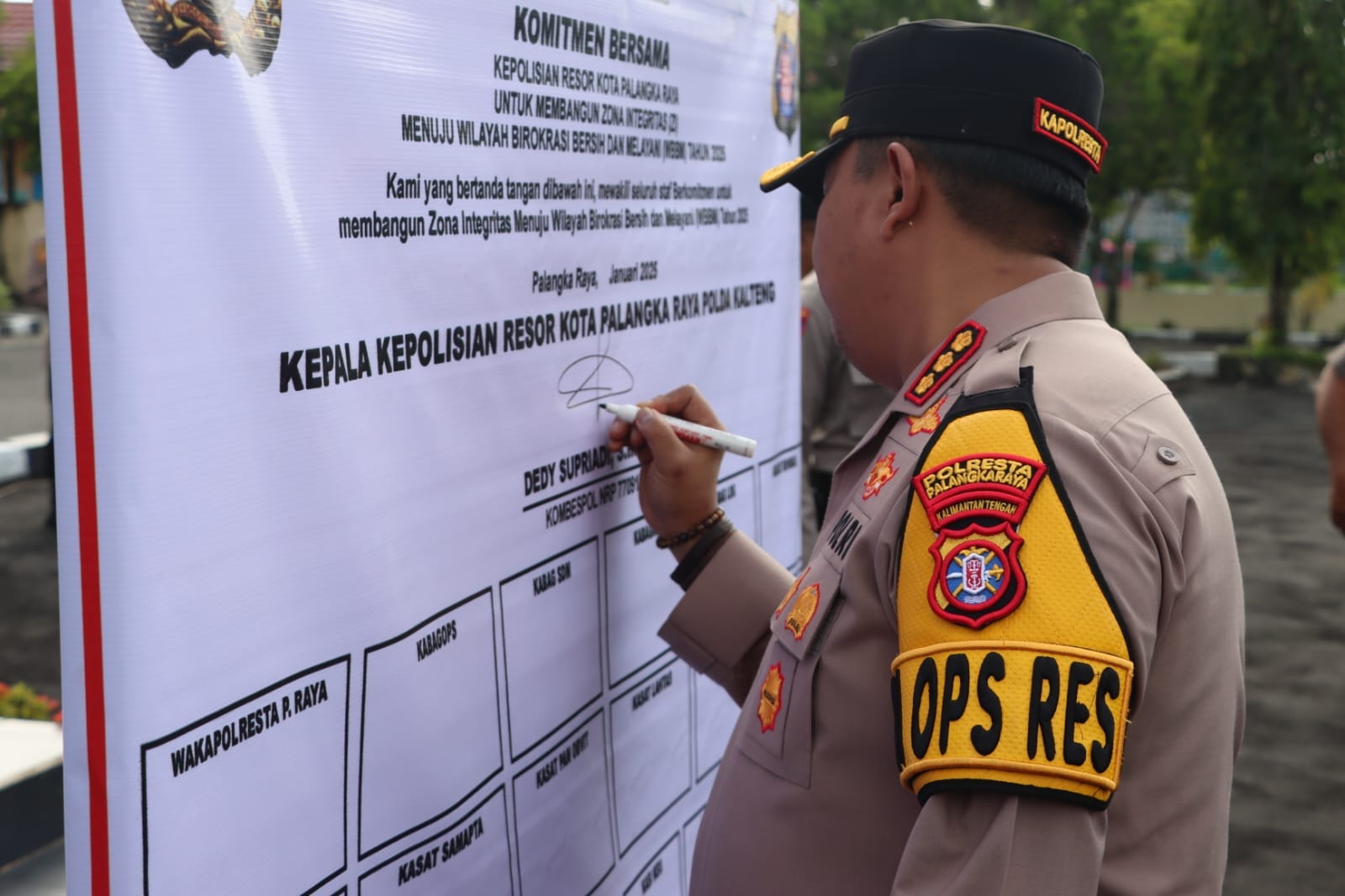 PALANGKA RAYA – Kepolisian Resor Kota (Polresta) Palangka Raya menegaskan komitmennya untuk membangun Zona Integritas (ZI) sebagai bagian dari upaya meraih predikat Wilayah Birokrasi Bersih dan Melayani (WBBM) pada tahun 2025. Langkah ini ditandai dengan penandatanganan komitmen bersama oleh Kapolresta Palangka Raya Kombes Pol Dedy Supriadi bersama para Pejabat Utama (PJU) dan Kapolsek jajaran, yang berlangsung di Mapolresta Palangka Raya baru-baru ini.