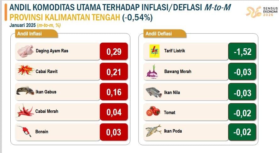 Berdasarkan data Badan Pusat Statistik (BPS) Kalteng, inflasi Januari 2025 tercatat sebesar 0,28 persen year-on-year (y-on-y), dengan Indeks Harga Konsumen (IHK) 106,06. Angka ini relatif lebih rendah jika dibandingkan inflasi nasional yang mencapai 1,57 persen (y-on-y).