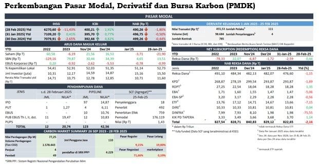 Selain itu, OJK mencatat tren positif dalam penghimpunan dana di pasar modal, dengan nilai penawaran umum mencapai Rp20,74 triliun hingga Februari 2025. Sementara itu, Bursa Karbon terus berkembang dengan total volume transaksi mencapai 1.578.443 tCO2e.