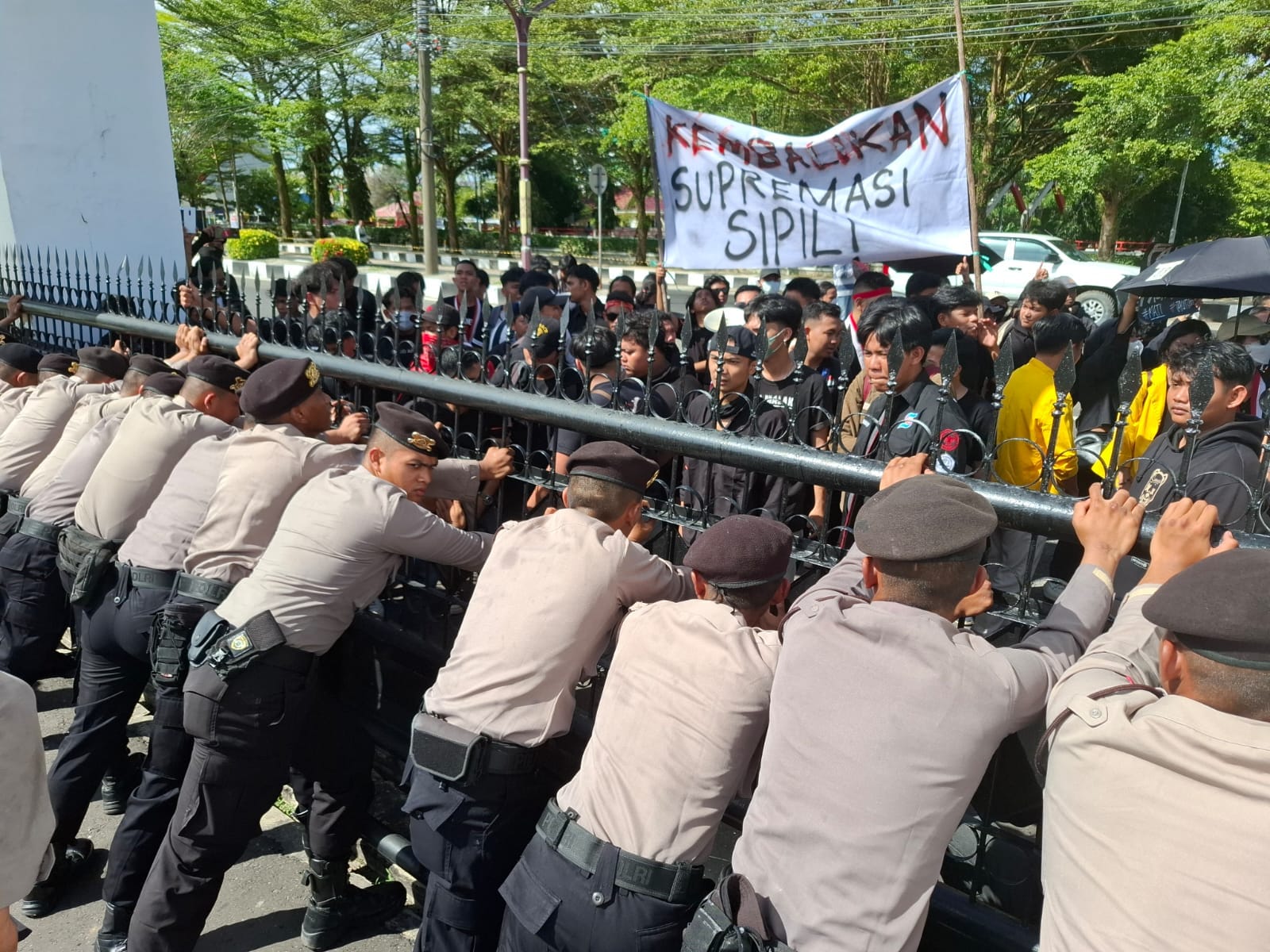 PALANGKA RAYA – Ratusan peserta aksi yang tergabung dalam Gerakan Masyarakat Sipil (Gemas) Kalimantan Tengah menggelar unjuk rasa di depan Kantor DPRD Kalimantan Tengah. Mereka menyampaikan tuntutan agar DPRD secara resmi menolak Rancangan Undang-Undang (RUU) TNI yang tengah menjadi sorotan. Dalam aksi tersebut, massa berupaya menyampaikan aspirasi mereka dengan berbagai cara, termasuk melalui orasi dan spanduk yang berisi penolakan terhadap regulasi tersebut.