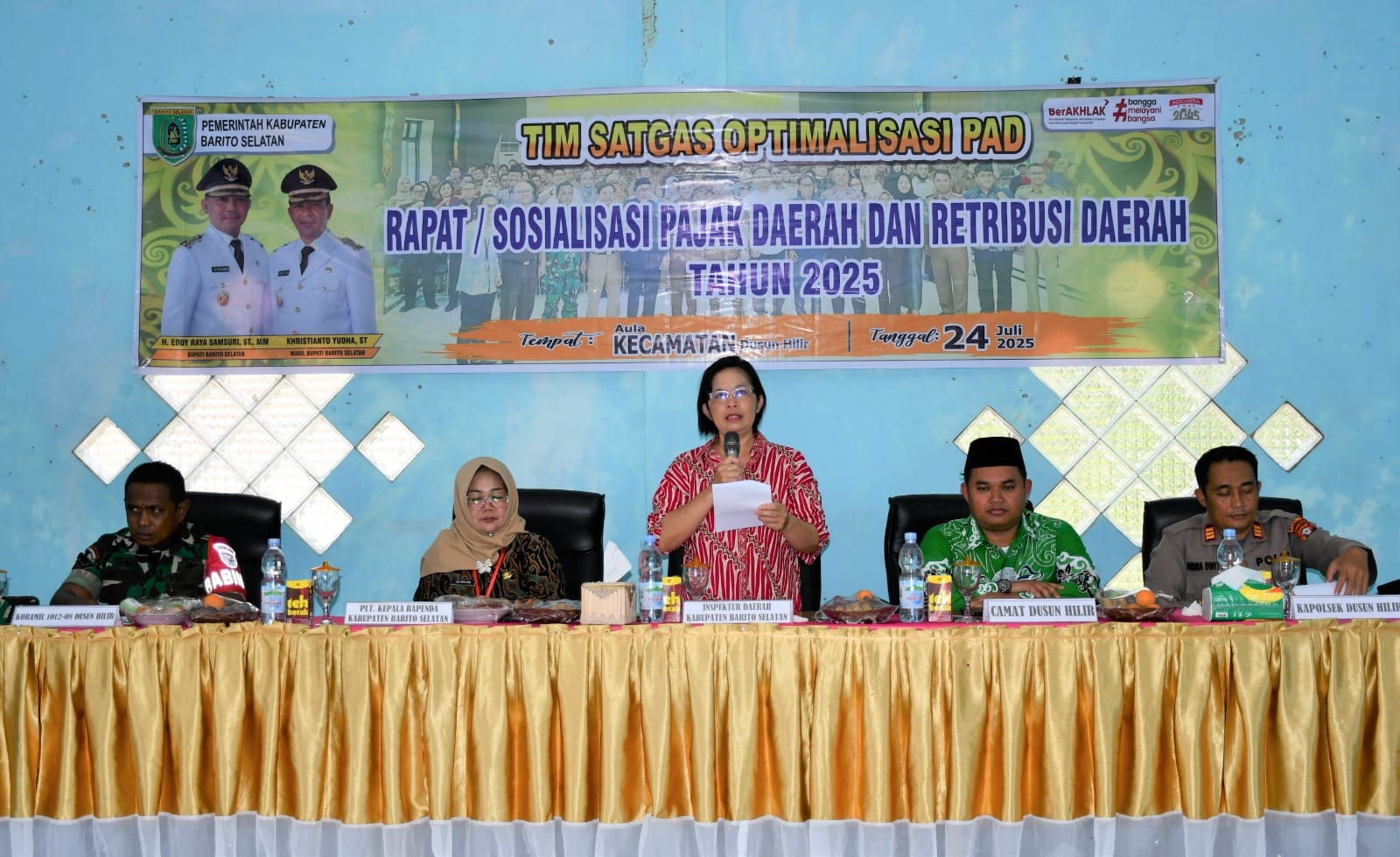 BUNTOK – Pemerintah Kabupaten Barito Selatan melalui Badan Pendapatan Daerah (Bapenda) mengadakan kegiatan Sosialisasi Pajak Daerah dan Retribusi Daerah Tahun 2025 di Aula Kantor Kecamatan Dusun Hilir, Kamis (24/07/2025). Acara ini dibuka oleh Inspektur Daerah, Yuristianti Yudha, mewakili Bupati Eddy Raya Samsuri.