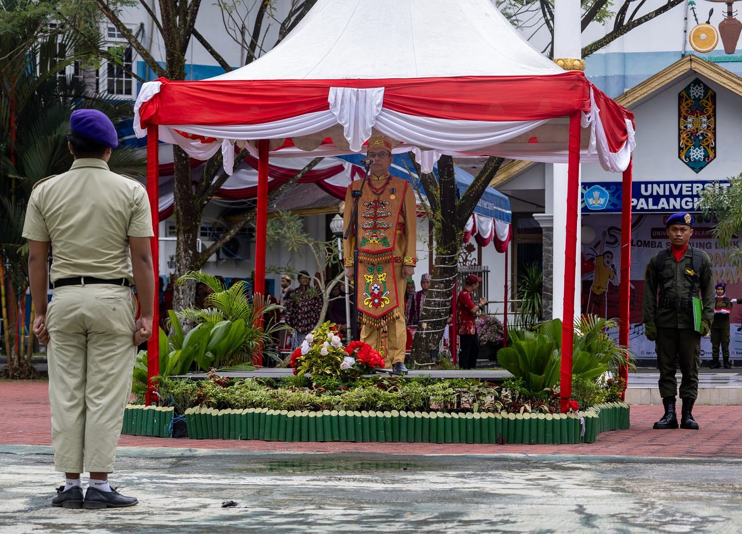 Rektor UPR, Prof. Dr. Ir. Salampak, M.S, yang bertindak sebagai Pembina Upacara, tampil mengenakan batik adat khas Kalimantan Tengah. Kehadirannya didampingi Ketua Dharma Wanita Persatuan UPR, Rosana, S.E., M.Si, serta jajaran pimpinan kampus.