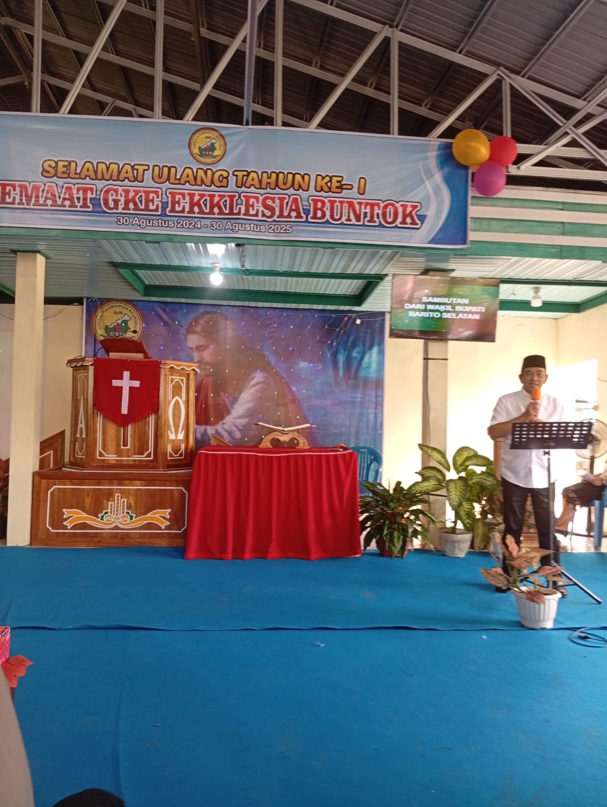 BUNTOK – Wakil Bupati Barito Selatan (Barsel) Khristianto Yudha menghadiri perayaan Hari Ulang Tahun (HUT) ke-I Gereja Ekklesia di Jalan Asam lintas Buntok–Palangka Raya, Minggu (30/8/2025).