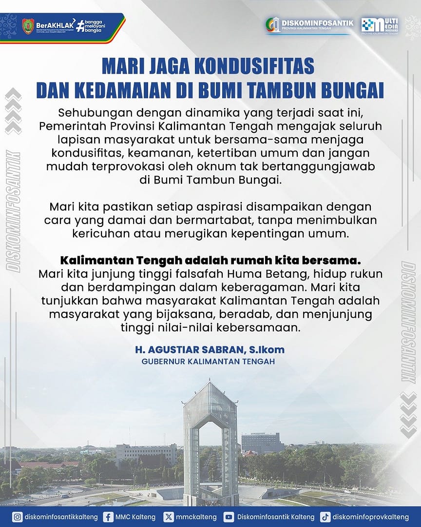 IMBAUAN – Sehubungan dengan dinamika yang terjadi saat ini, Pemerintah Provinsi Kalimantan Tengah mengajak seluruh lapisan masyarakat untuk bersama-sama menjaga kondusifitas, keamanan, ketertiban umum dan jangan mudah terprovokasi oleh oknum tak bertanggungjawab di Bumi Tambun Bungai.