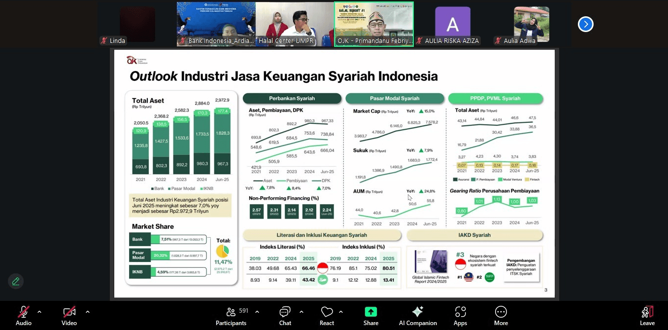 PALANGKARAYA – Otoritas Jasa Keuangan (OJK) Provinsi Kalimantan Tengah berkolaborasi dengan Universitas Muhammadiyah Palangka Raya, Bank Indonesia, dan Dinas Perindustrian serta Perdagangan Provinsi Kalimantan Tengah dalam menggelar kegiatan edukasi mengenai pentingnya keuangan syariah. Acara ini terselenggara secara hybrid melalui platform digital, Selasa, 30 September 2025.