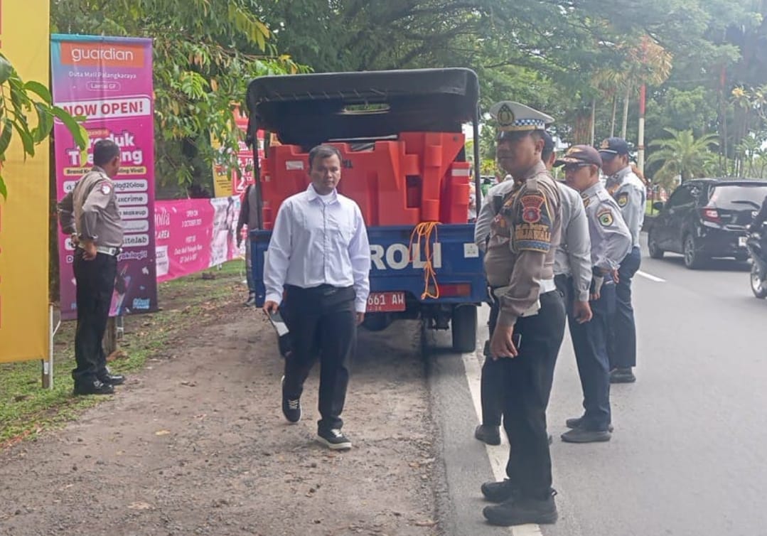 Pemasangan garis larangan parkir di kawasan Duta Mall, Kota Palangka Raya pada Senin (6/10/2025).