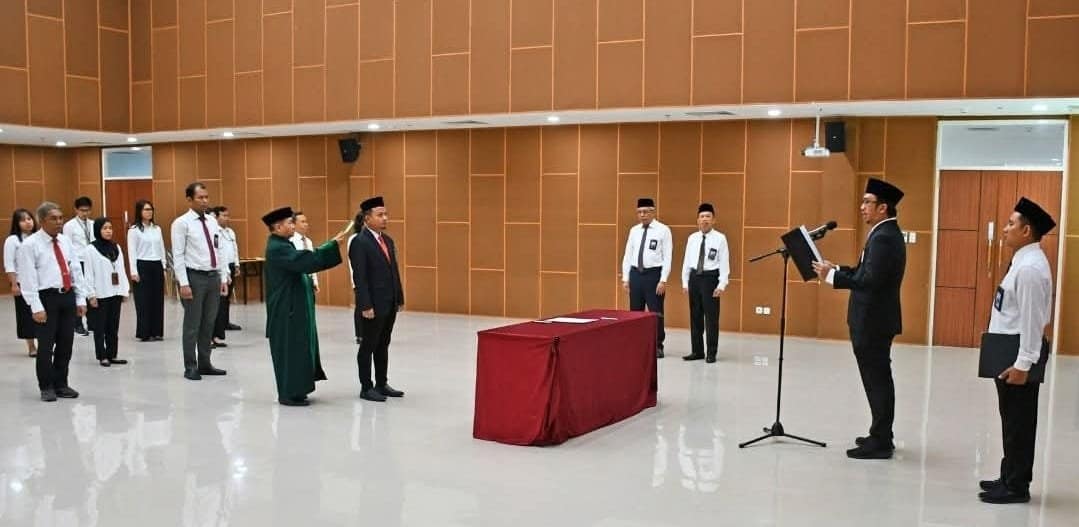 Prosesi pelantikan berlangsung khidmat di Aula Batang Garing, Rabu (8/10/2025), dihadiri jajaran pegawai, Dharma Wanita Persatuan, serta rohaniwan dari Kanwil Kementerian Agama Kalteng yang memimpin pengambilan sumpah jabatan.
