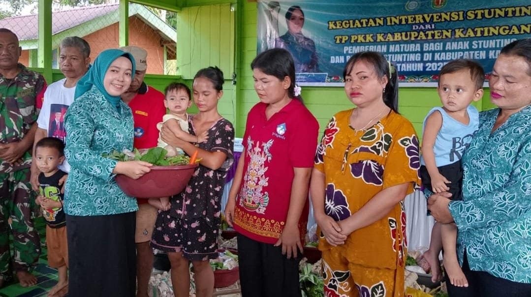 Ketua Tim Penggerak Pemberdayaan dan Kesejahteraan Keluarga (TP-PKK) Kabupaten Katingan, Sumiati Saiful, memimpin kegiatan intervensi stunting melalui pemberian natura bagi anak-anak stunting dan berisiko stunting di Kecamatan Sanaman Mantikei dan Petak Malai, pada Rabu (15/10/2025).