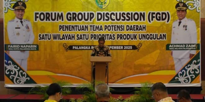 PALANGKA RAYA – Pemerintah Kota Palangka Raya melalui Badan Perencanaan Riset dan Inovasi Daerah (Bapperida) menggelar Focus Group Discussion (FGD) bertajuk Penentuan Tema Potensi Daerah, Satu Wilayah Satu Prioritas Produk Unggulan di Aula Swiss-Belhotel Palangka Raya, Kamis (06/11/2025) kemarin.