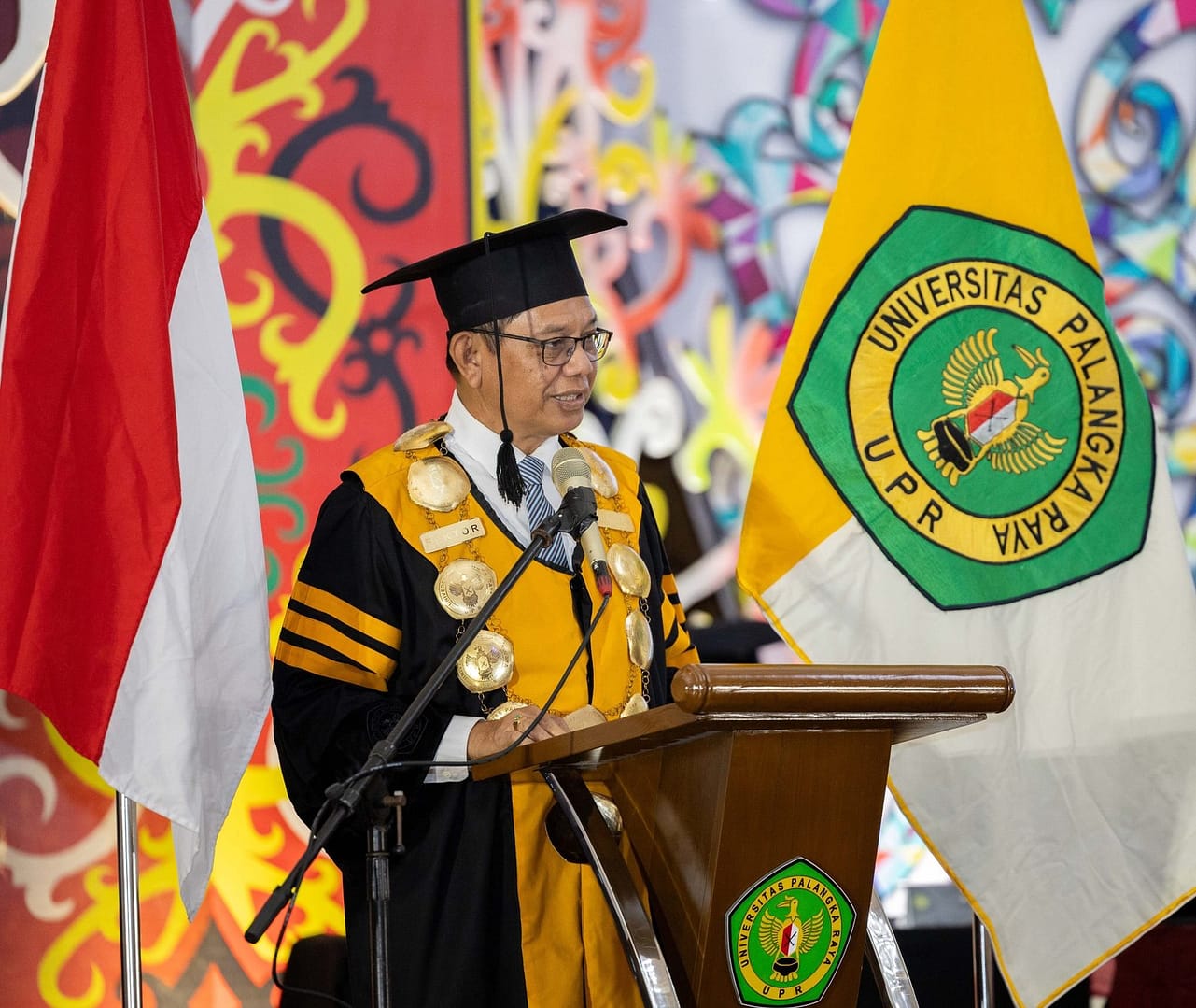 Rektor Universitas Palangka Raya (UPR), Prof. Dr. Ir. Salampak, M.S., IPU dalam sambutannya menyampaikan apresiasi dan ucapan selamat kepada seluruh wisudawan atas capaian akademik yang telah diraih. Ia menegaskan bahwa lulusan UPR memiliki peran strategis sebagai insan intelektual yang berkarakter, berintegritas, serta mampu berkontribusi nyata bagi pembangunan daerah, bangsa, dan negara.