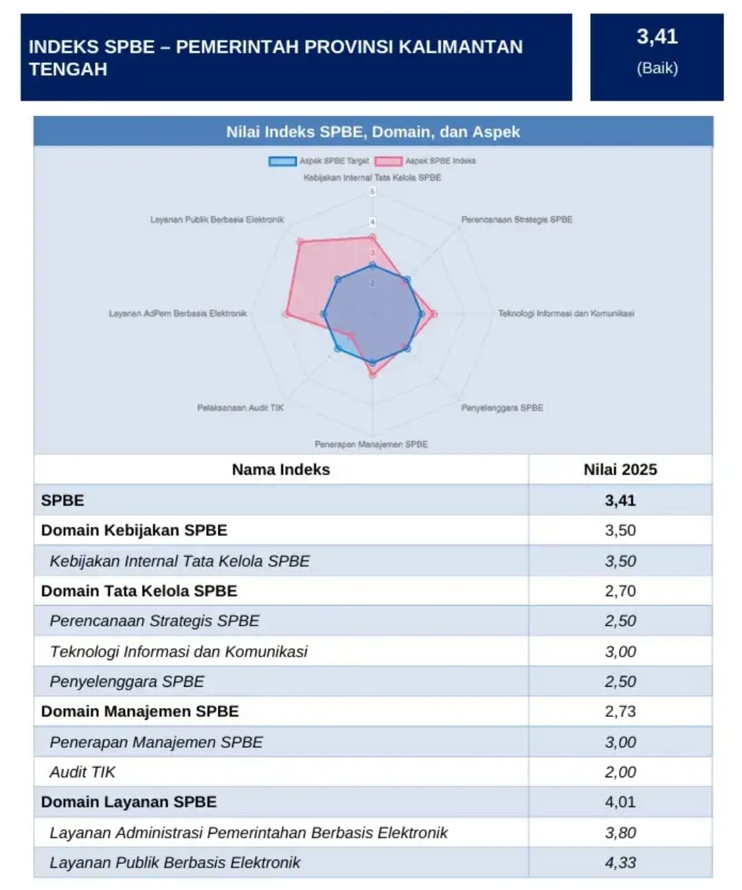 Berdasarkan hasil Pemantauan SPBE Tahun 2025 yang dirilis Tim Koordinasi SPBE Nasional pada Rabu (7/1/2026) melalui Aplikasi Tauval di laman tauval.spbe.go.id, Indeks SPBE Kalteng tercatat sebesar 3,41 dengan kategori Baik.