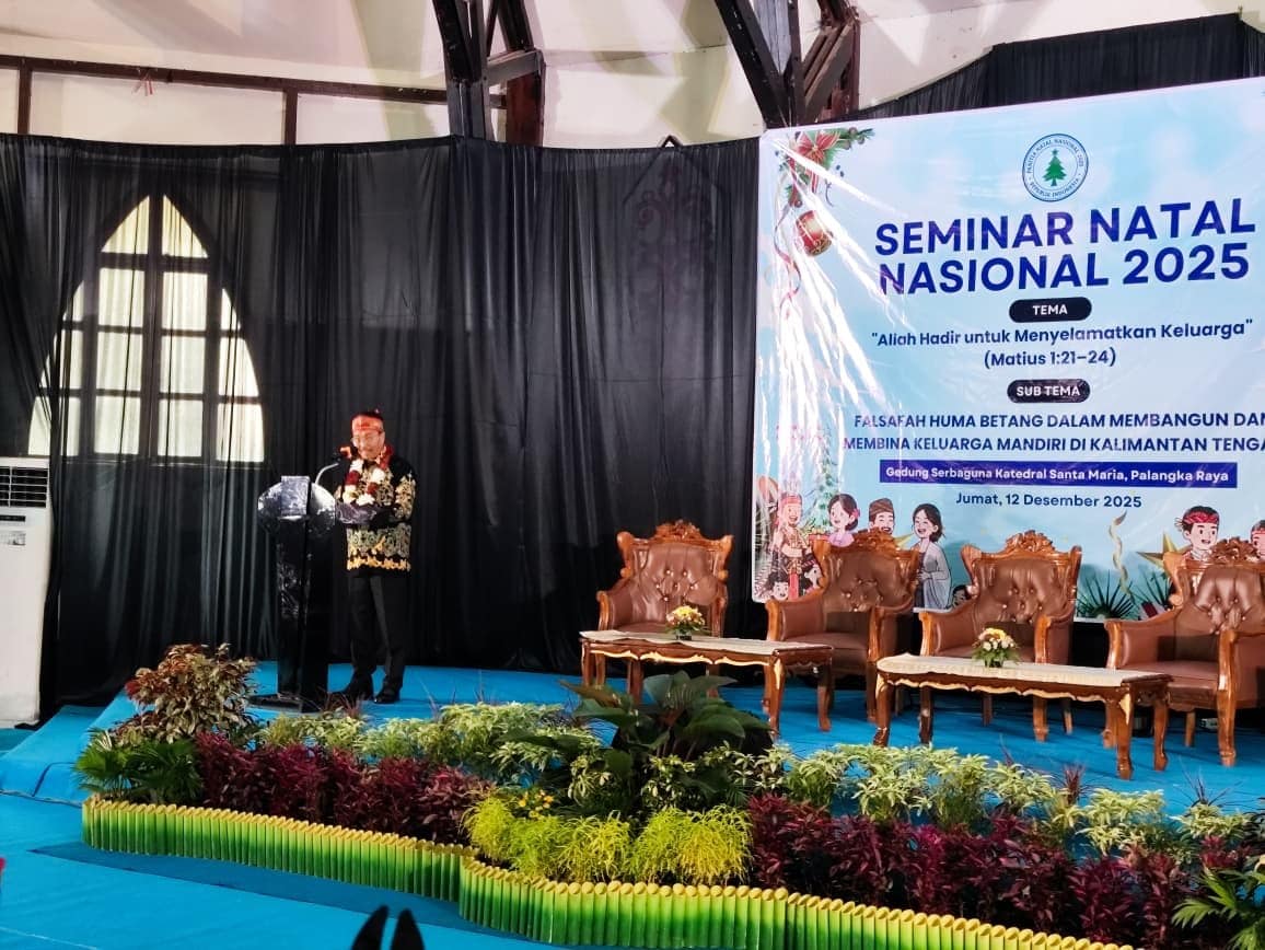 PALANGKA RAYA – Seminar Natal Nasional 2025 menjadi momentum penting bagi Kalimantan Tengah dalam meneguhkan kembali nilai kearifan lokal dalam membangun ketahanan keluarga. Kegiatan yang diselenggarakan serentak di sembilan kota ini berlangsung di Gedung Serbaguna Tjilik Riwut, Jumat, 12 Desember 2025, dengan tema nasional “Allah Hadir untuk Menyelamatkan Keluarga” dan subtema daerah “Falsafah Huma Betang dalam Membangun dan Membina Keluarga Mandiri di Kalimantan Tengah.”
